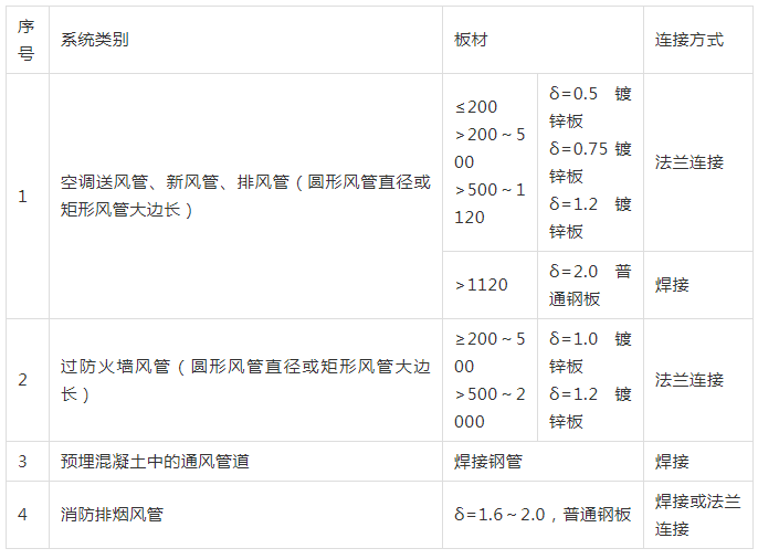 2、風管材質(zhì)及連接見下表
