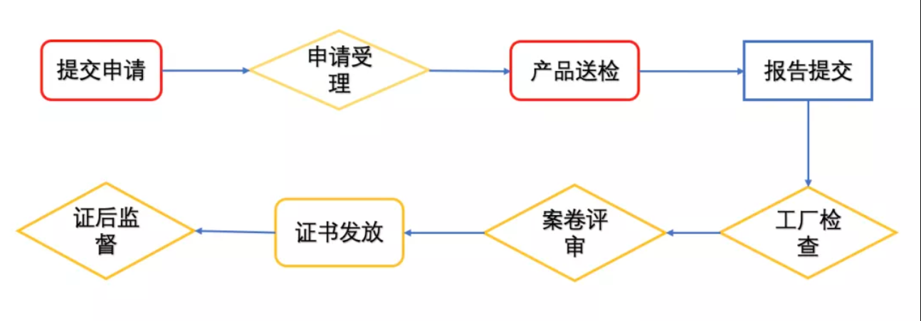 首次認證一般流程(紅框為認證企業(yè)操作,黃框為認證機構(gòu)操作,藍框為檢驗機構(gòu)操作)
