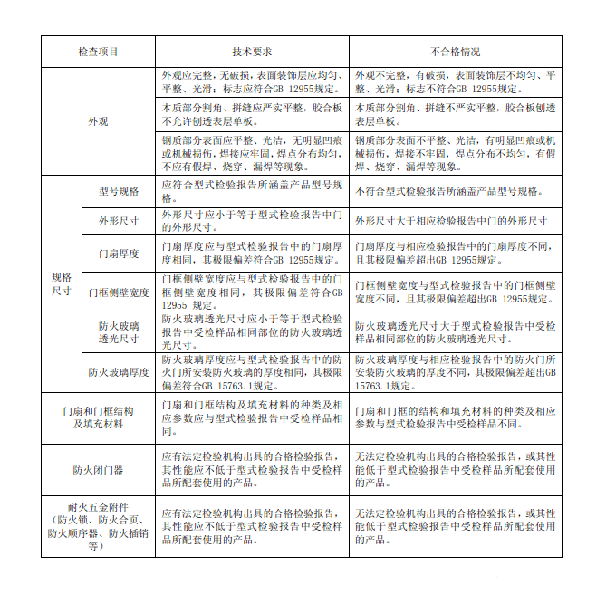 2 檢查規(guī)格型號是否與型式檢驗報告中受檢防火門樣品所配套使用的相一致;或?qū)φ蘸细駲z驗報告,核對其性能是否低于型式檢驗報告中受檢樣品所配套使用的產(chǎn)品。