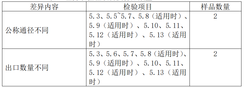 認證委托人在單元內選取公稱通徑最大的型號作為典型產(chǎn)品型號進行 5.2.3、5.3、5.5~5.7、5.8(適用時)、5.9(適用時)、5.10、5.11、5.12 (適用時)、5.13(適用時)、5.14 項目的檢驗,其他型號按照表 1 規(guī)定 進行差異項檢驗。