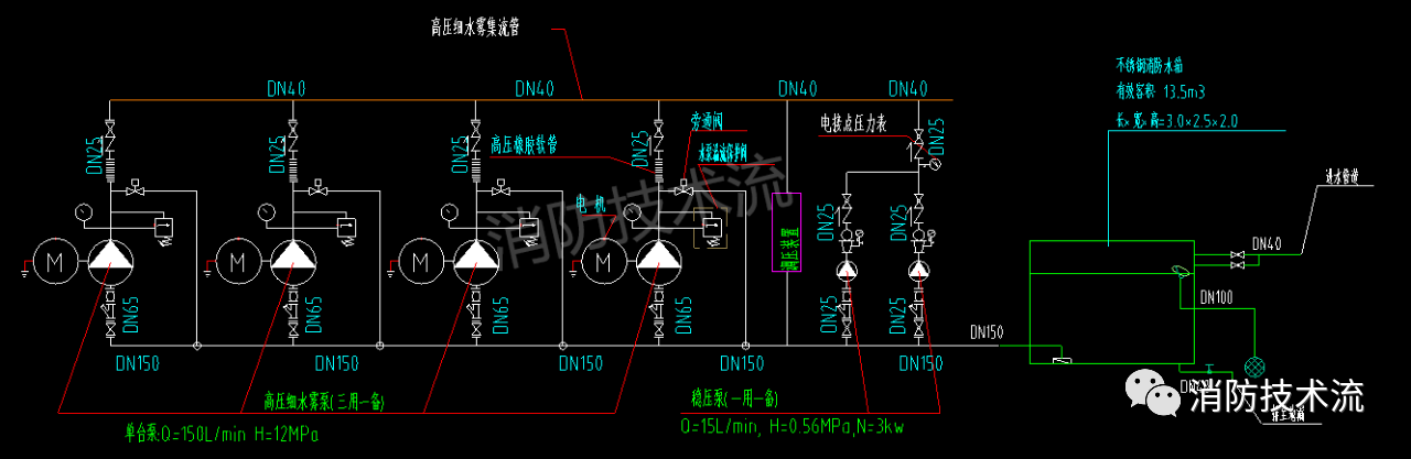 6、細水霧滅火介質(zhì)采用淡水,系統(tǒng)用水量為1.5t,設置有效容積為13.5m?儲水箱,水箱材質(zhì)采用不銹鋼,儲水箱的出水口高于水泵的入水口(即水箱出水口對水泵入水口保持正壓)